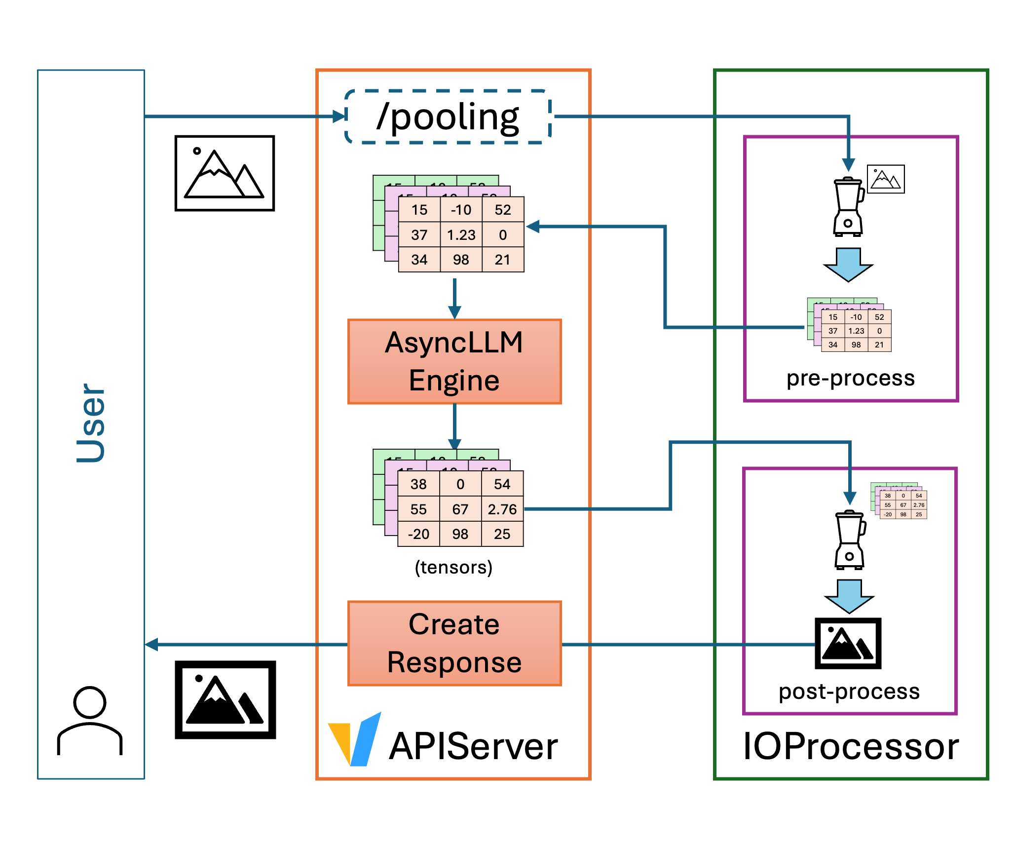 This is where the new IO Processor plugin framework we introduced comes in. The IO Processor framework allows developers to customize how model inputs and outputs are pre- and post-processed, all within the same vLLM serving instance. Whether your model returns a string, a JSON object, an image tensor, or a custom data structure, an IO Processor can translate it into the desired format before returning it to the client.