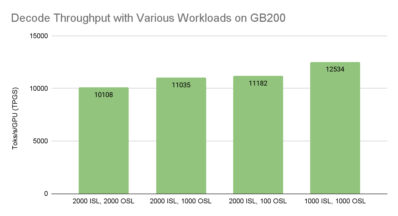 We also benchmarked the DeepSeek-V3/R1 decode throughput on GB200 for a range of standard workloads, maintaining the same parallelism setup while varying the decode batch size that fully utilizates GPU memory.
