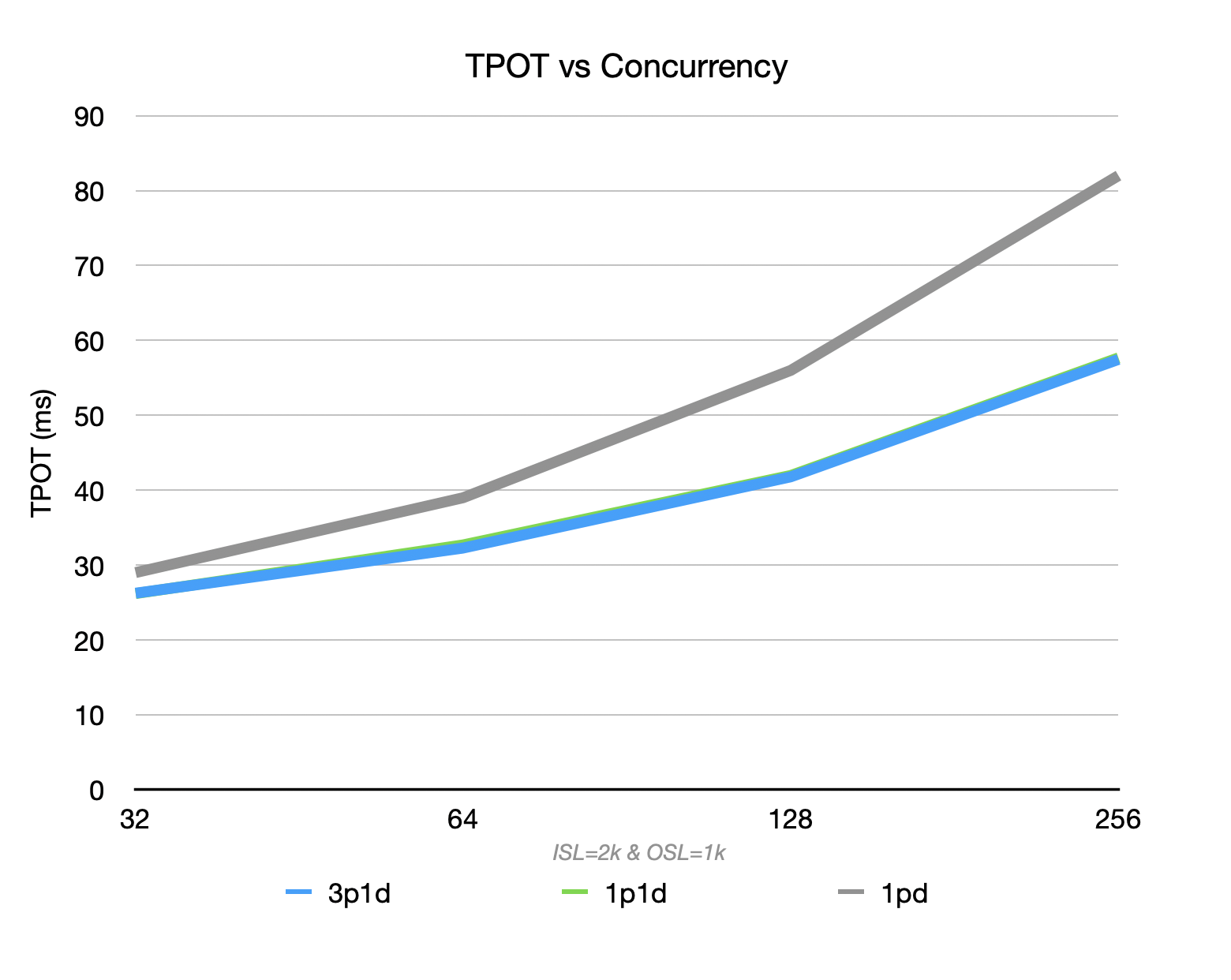 Regarding TPOT, both 1P1D and 3P1D outperform the non-disagg setup. At a batch size of 256, the disagg setup suppresses TPOT within 60ms, while the integrated setup exceeds 80ms.