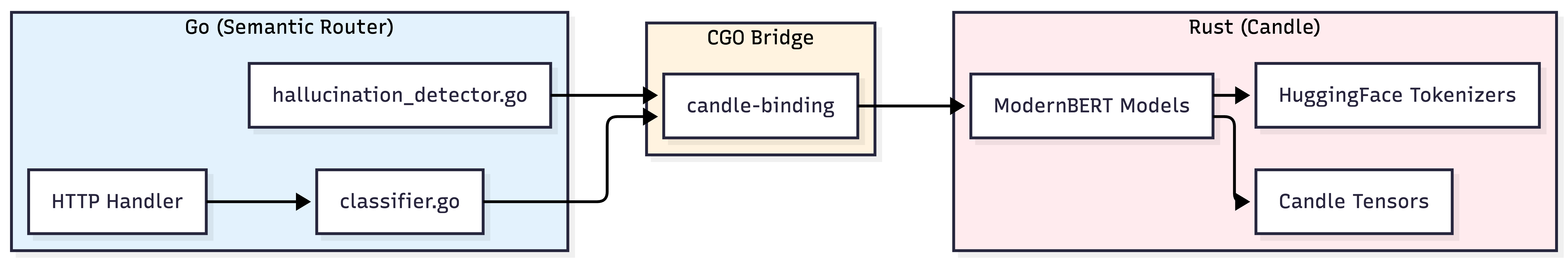All three models run natively via Candle (Hugging Face's Rust ML framework) with CGO bindings to Go: