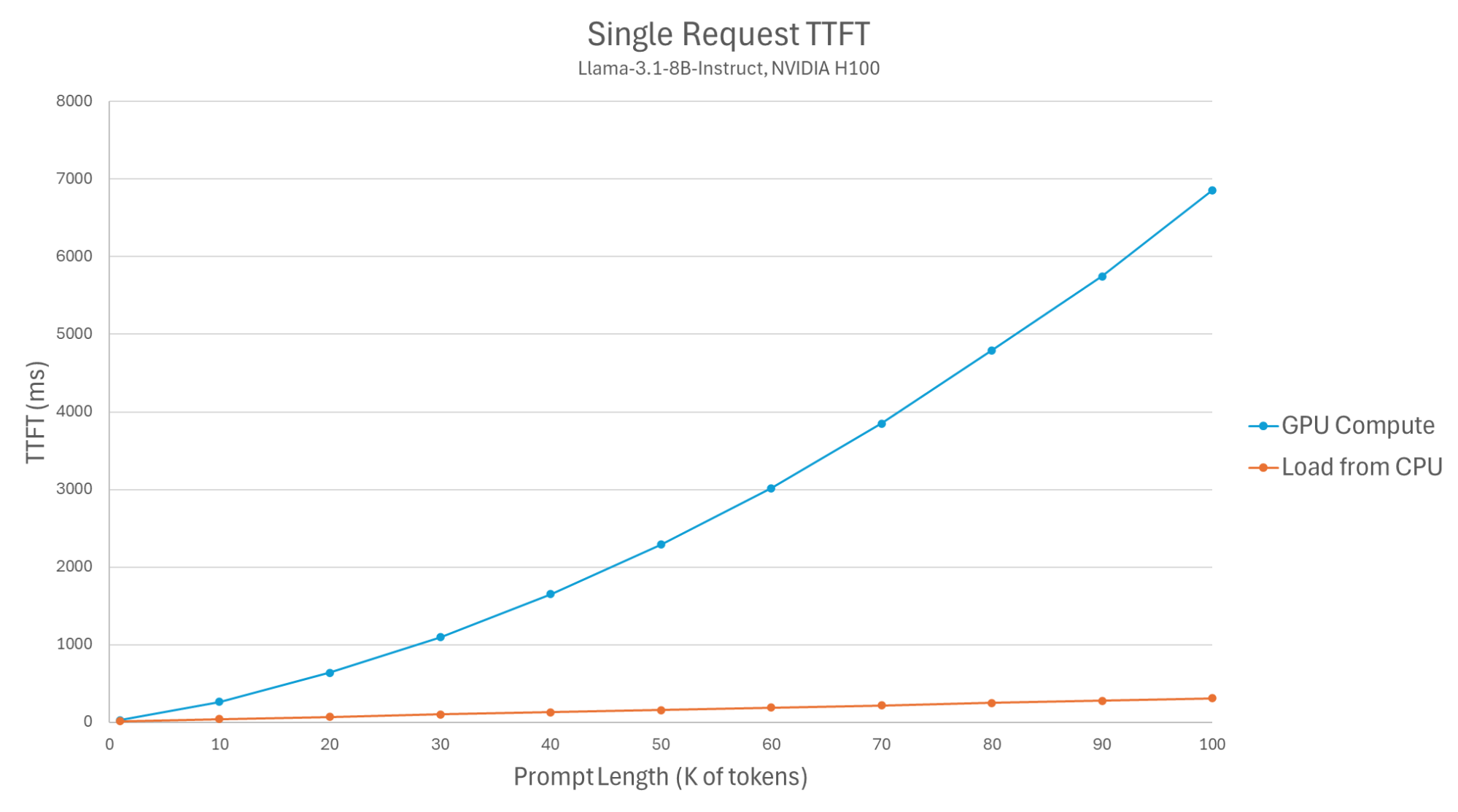 The results demonstrate that loading KV values from the CPU reduces TTFT by X2-X22, depending on the prompt size. The exact setup and code for our benchmarks appear at the end of this blog.