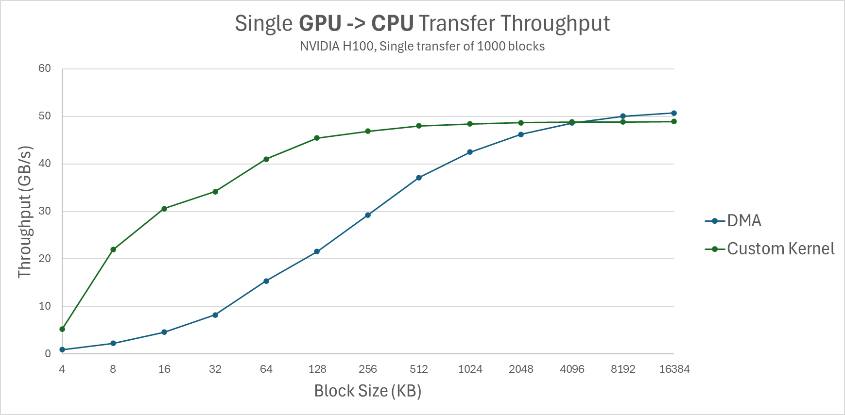 In summary, we see that our change in GPU memory layout allows us to utilize the DMA for KV transfers, achieving better overall throughput.