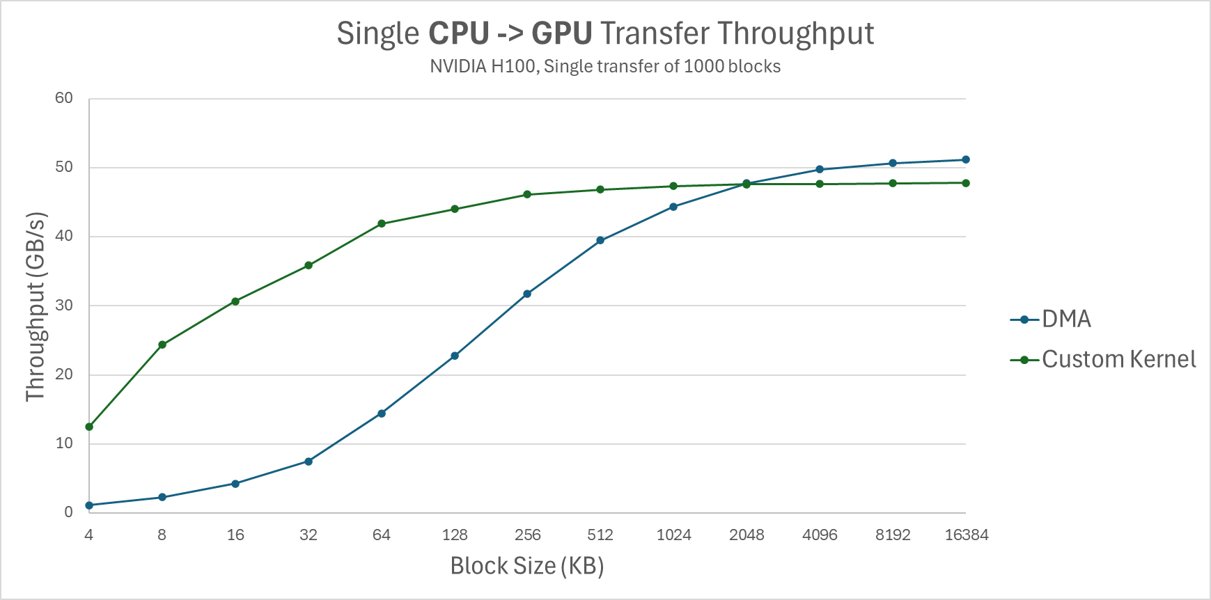 The results confirm that DMA performs well, but only for larger block sizes. For smaller block sizes, the custom kernel achieves significantly better throughput. We note however that the results of the custom kernel are more noisy, suffering a bigger variance.