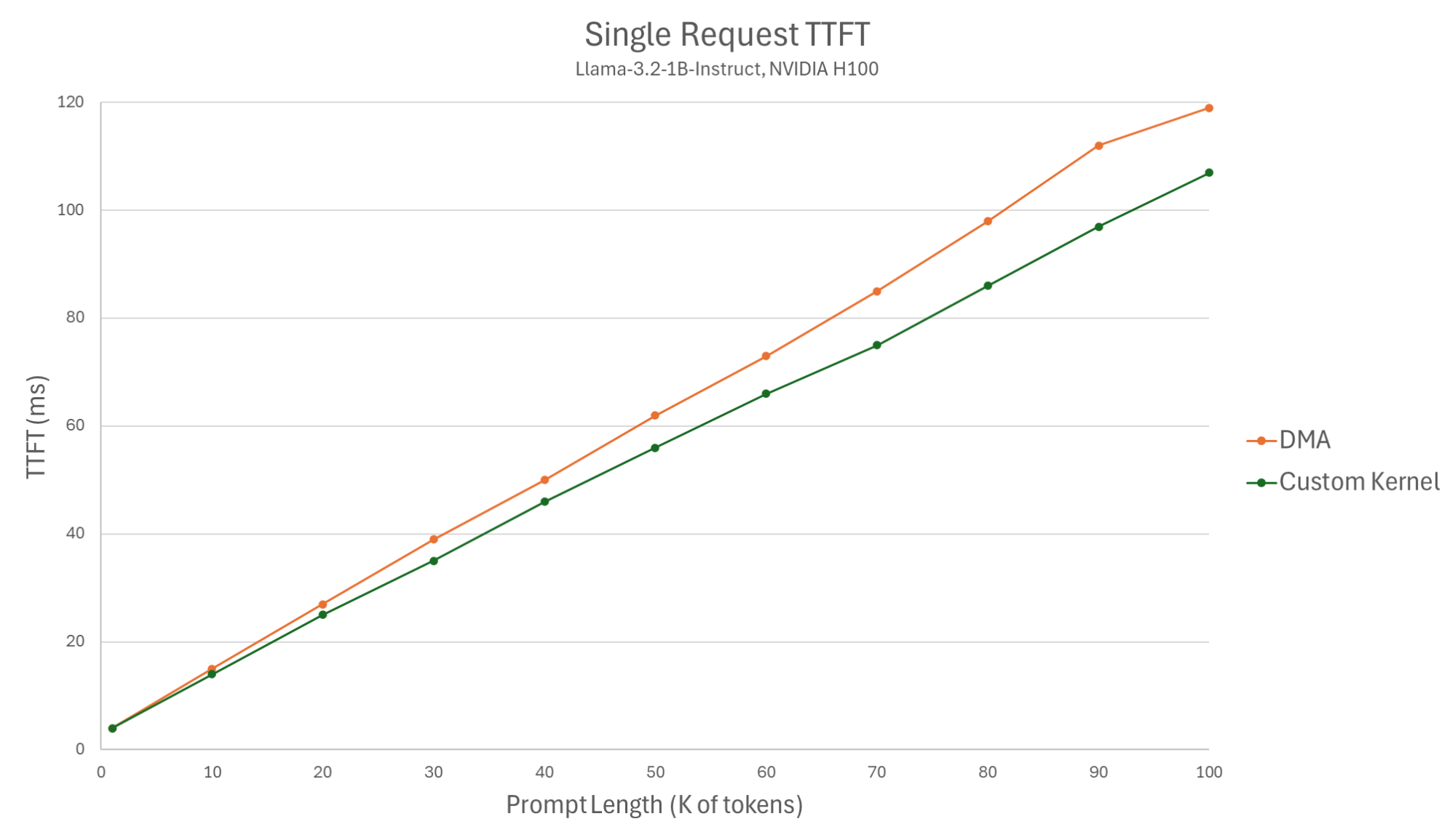 We emphasize that we presented results with the worst case model for the DMA approach. The most common models have a bigger physical block size and hence favor the DMA even more. With Llama-3.1-8B-Instruct as an example, the DMA gained up to 32% more throughput over the custom kernel while matching its TTFT.