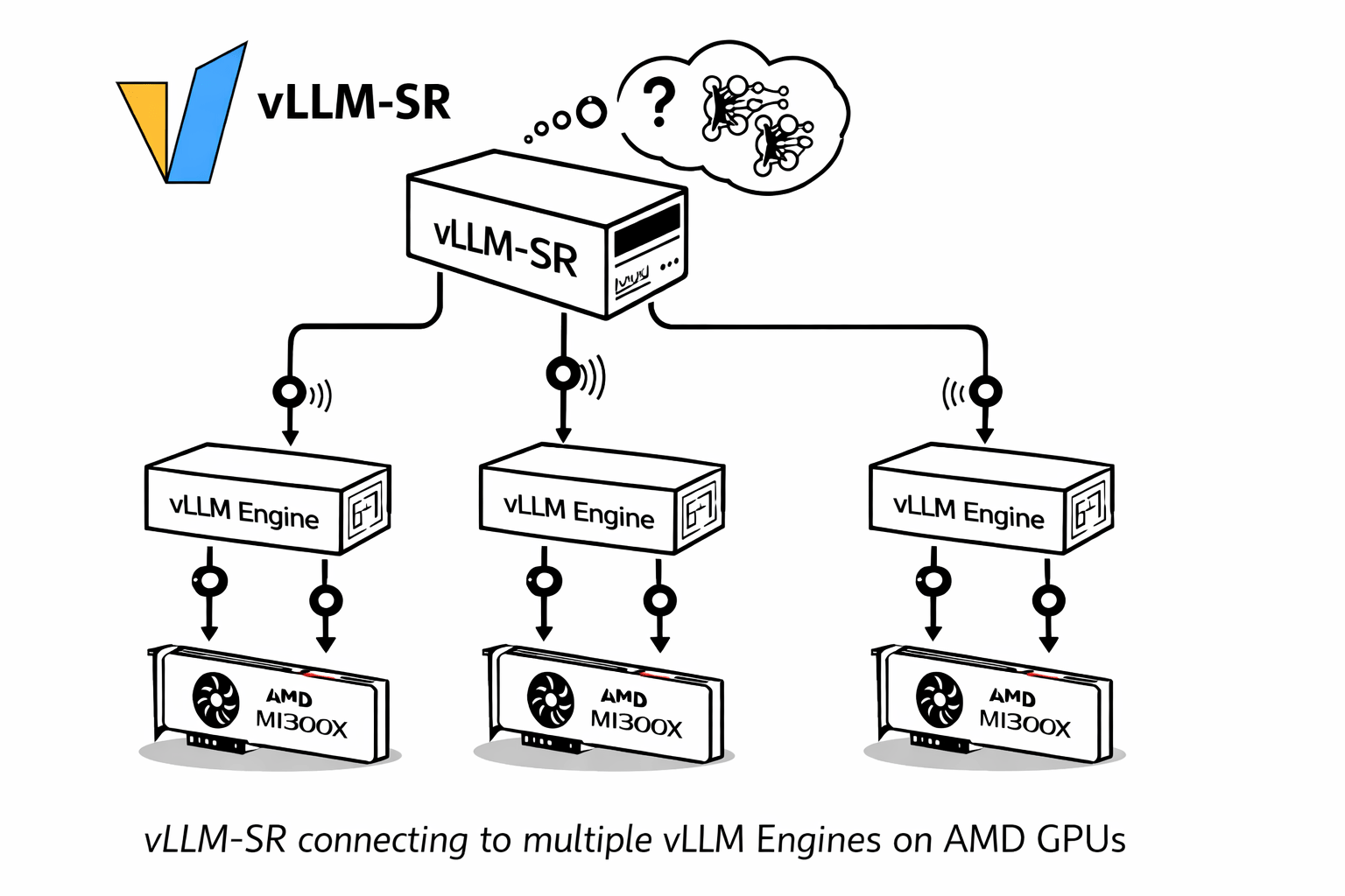 With vLLM Semantic Router (vLLM-SR) v0.1, we've deployed a live MoM system on AMD MI300X/MI355X GPUs that demonstrates these capabilities in action—routing queries across 6 specialized models using 8 signal types and 11 decision rules with the performance boost.