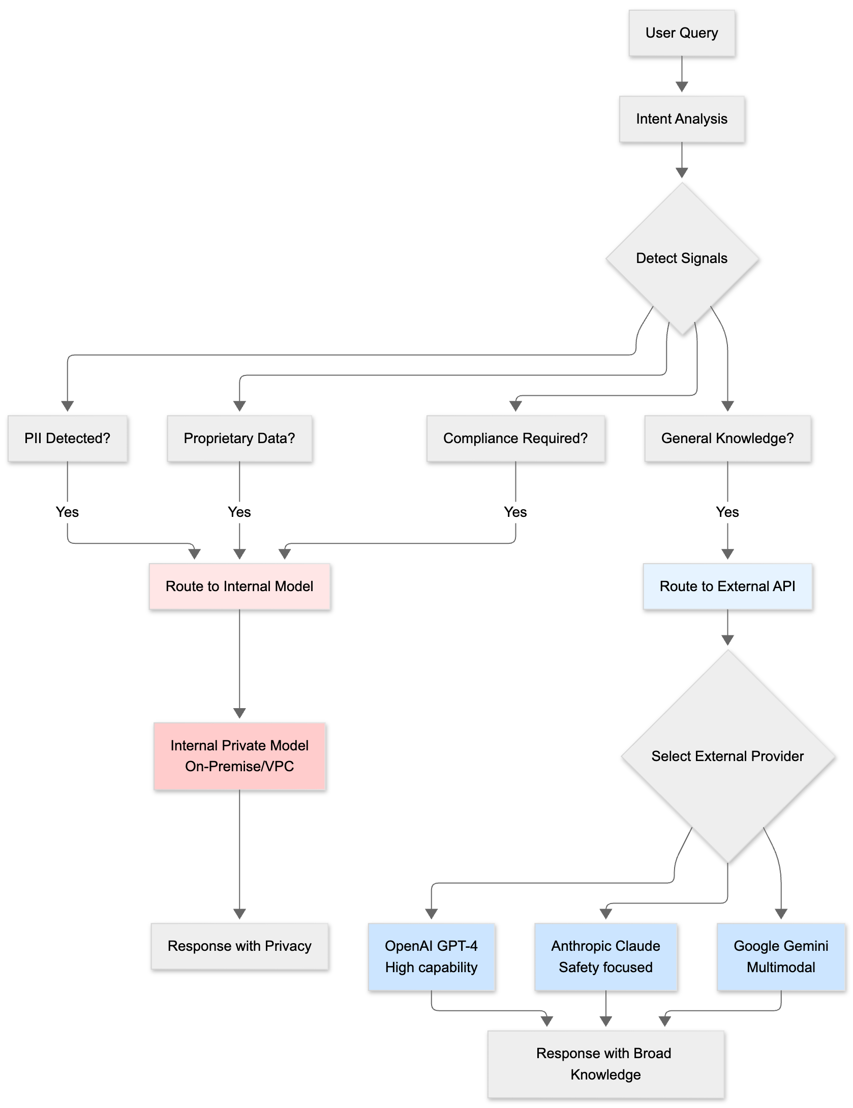 Intent-Aware Internal/External Model Selection: Smart routing between internal private models and external APIs (OpenAI, Anthropic, etc.) based on intent analysis. Sensitive data and proprietary information automatically route to internal models for privacy and compliance, while general queries leverage external APIs for broader knowledge. Cost, latency, and compliance requirements are balanced dynamically based on query characteristics.