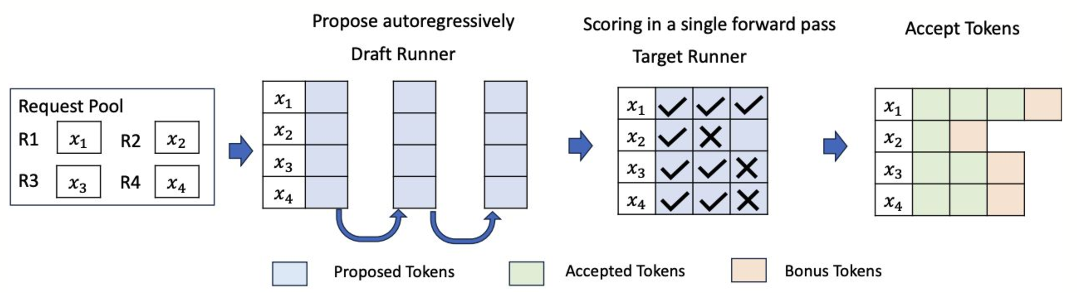 • Draft Runner: This runner is responsible for executing the smaller model to propose candidate tokens.