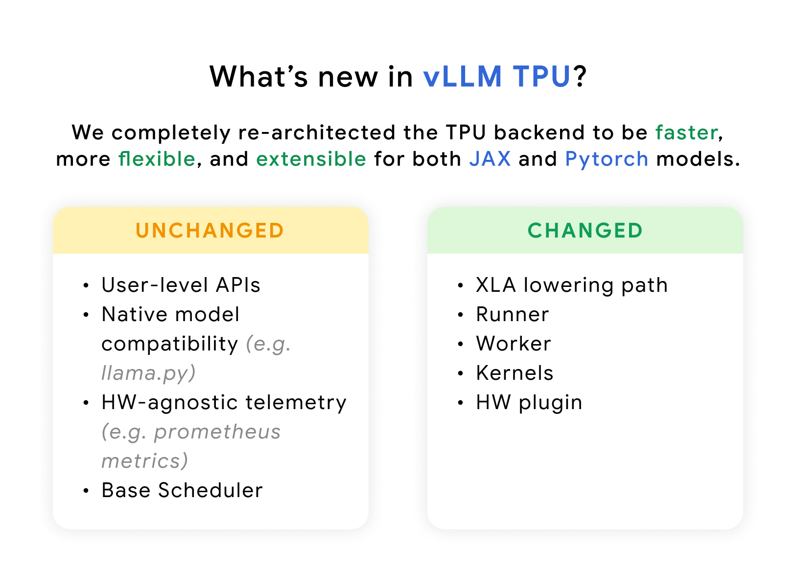 This new vLLM TPU redesign with tpu-inference aims to optimize performance and extensibility by supporting PyTorch (via Torchax) and JAX within a single unified JAX→XLA lowering path.